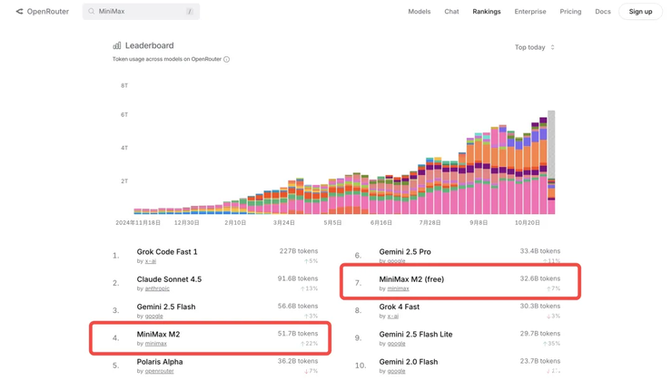 从市场表现来看,MiniMax M2 赢得了广大开发者和用户的认可。11月初,MiniMax M2 在 OpenRouter上的日token消耗量超过50B,成为中国首个达到这一里程碑的模型。