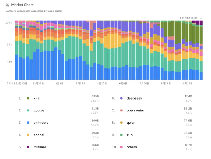 在 Token 使用的市场份额方面,OpenRouter 的11月9日数据显示,市场份额排名前9的模型4家来自中国公司,其中MiniMax的份额排名仅次于 xAI、Google、Anthropic 和OpenAI。而且,上榜中国公司的模型均为开源模型。