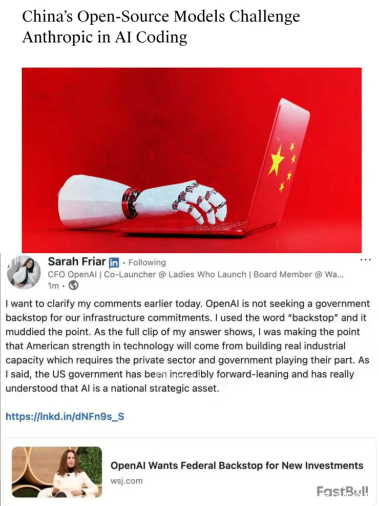 二是,资本的豪赌与泡沫风险都更加剧烈——OpenAI 与英伟达等厂商签下了 1.4 万亿美元算力订单;OpenAI CFO 一句“需要政府为 AI 投资担保”的言论引发了美股科技股大地震,八大科技巨头一周内蒸发近 8000 亿美元。
